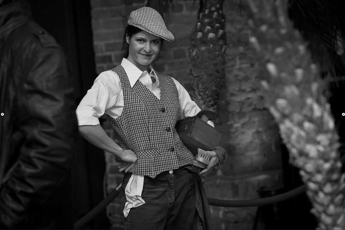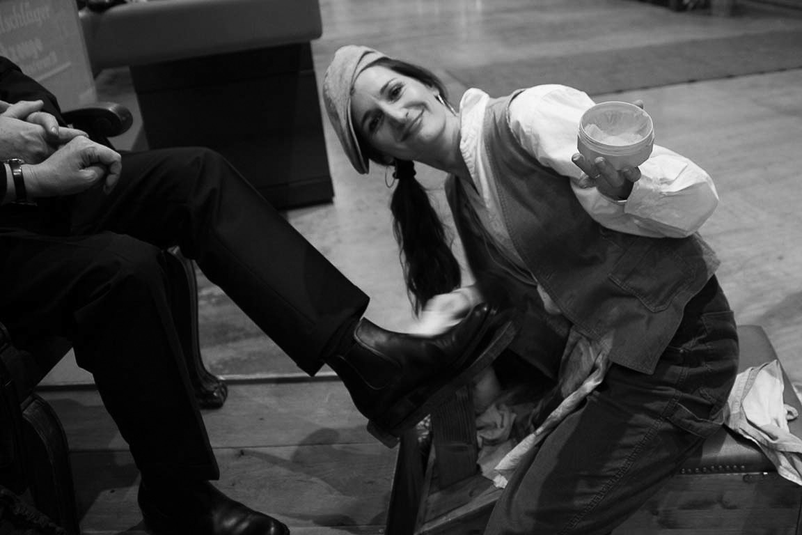 Die Schuhputzerin bietet eine in Deutschland lang vergessene Dienstleistung. Mit der passenden Schuhwichse und noch trefflicheren Sprüchen und Ratschlägen verbindet sie die Zeitreise in das Berlin der 20er Jahre mit einem nützlichen Nebeneffekt: Die Schuhe strahlen an dem Abend mit den Gästen um die Wette.