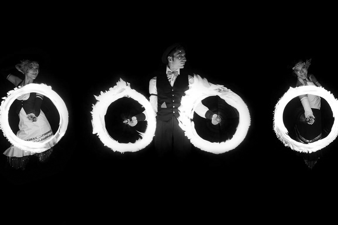 Mit brennendem Schirm, Charme und Melone laden die Feuerkünstler von Looop zum Feuertanz. Mal spielt die Diva mit einem lodernden Feuerreifen zu mitreißendem Elektroswing. Mal gibt Monsieur ganz publikumsnah seine gefährlichsten Tricks zum Besten oder fordert selbstbewusst zum Tango auf — ein extravaganter Auftritt voll spektakulärer Feuerkunst.
