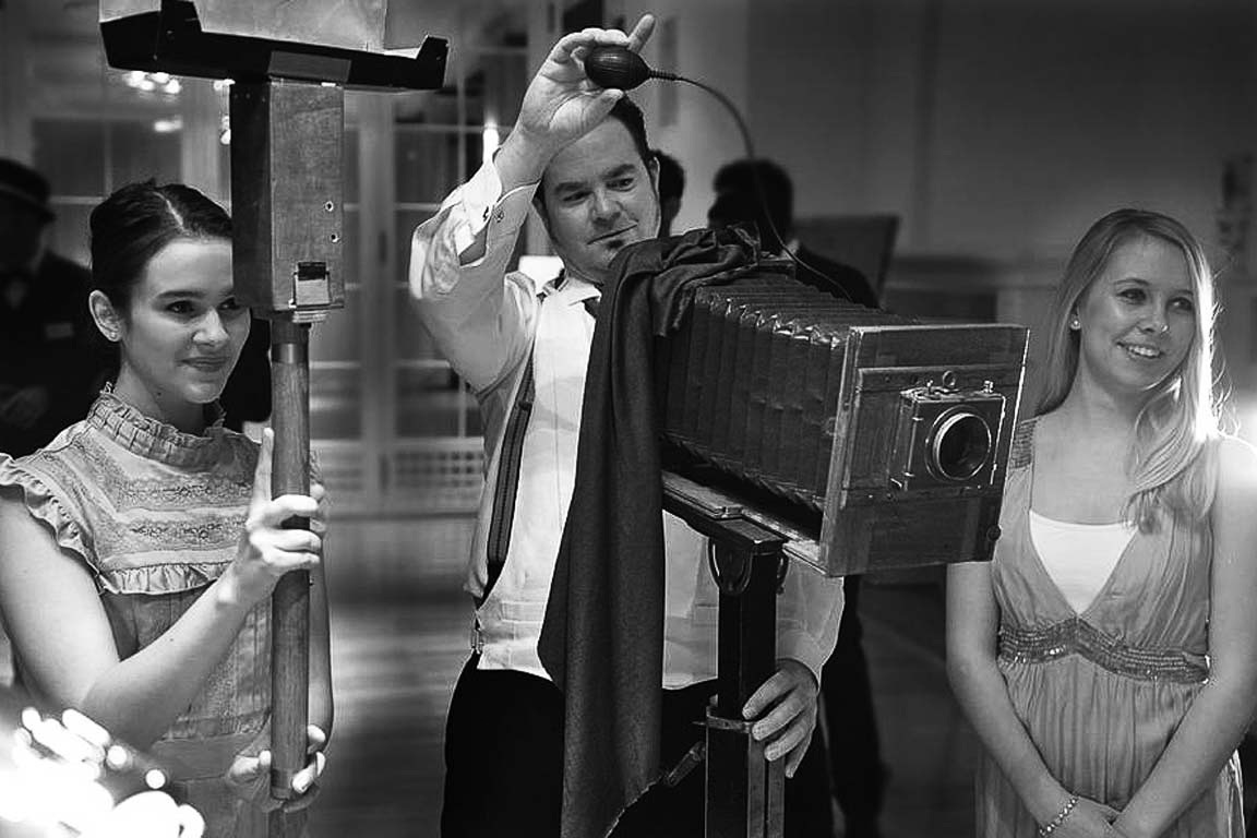 Mit einem grellen Magnesiumblitz und der historischen Fotoausrüstung gelingt der Sprung in die Vergangenheit auf Knopfdruck. Der Fotograf und sein Team erzeugen dabei in neuzeitlicher Geschwindigkeit verblüffende Fotoergebnisse und tolle Andenken an die Veranstaltung.